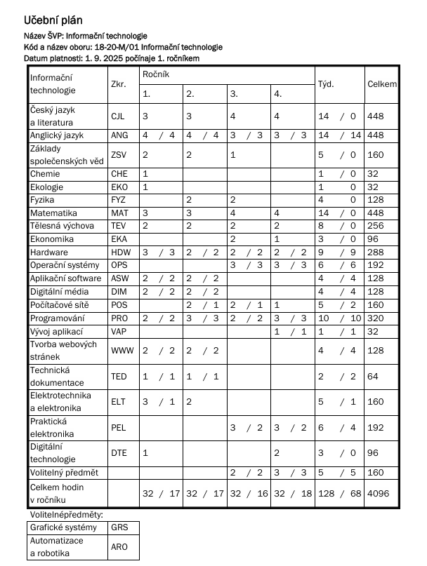 Obor Informační technologie připravuje žáky pro činnosti vyžadující znalosti zejména v oblastech hardwaru, systémového softwaru, počítačových sítí, základů programování, tvorby webových stránek a grafiky. Od 3. ročníku si student může rozšířit svou odbornost o volitelný předmět automatizace a robotika nebo grafické systémy.