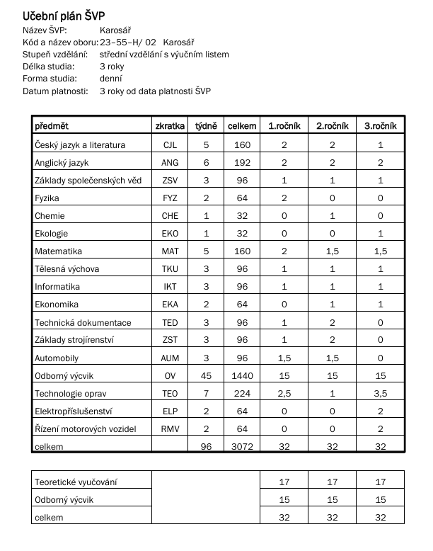 U nás tě na oboru připravíme na opravy karoserií vozidel, renovace těch silničních i kolejových, nebo na výrobu nových. Podle nejmodernějších požadavků trhu se učíš s mnoha druhy materiálů (ocel, hliník, karbon, plast)