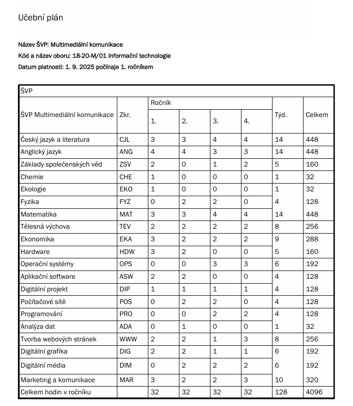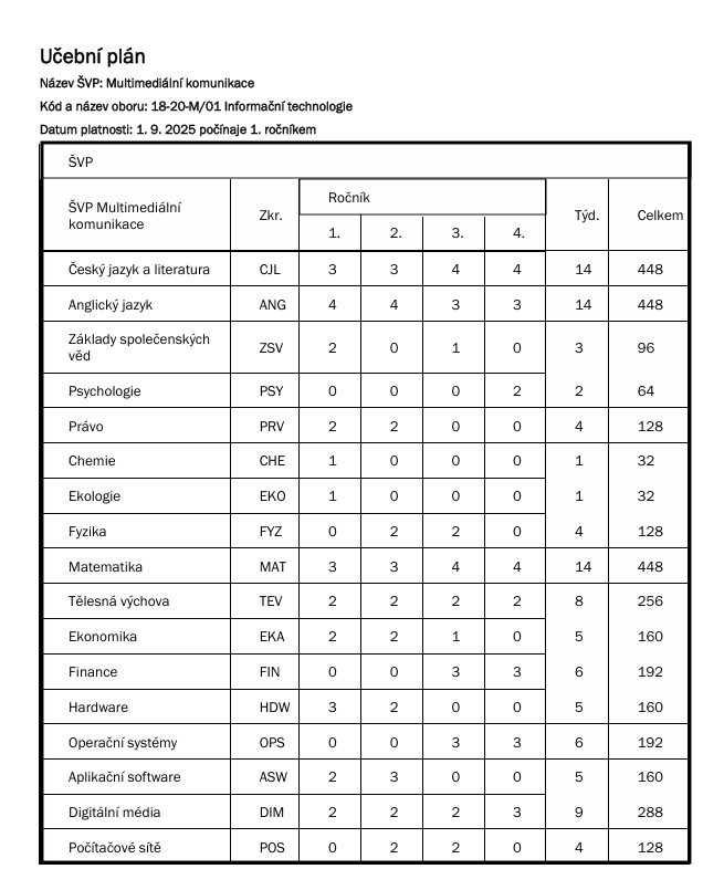 Obor Informační technologie – mulimediální komunikace obeznamuje žáky se základními znalostmi oborů informačních technologií, zejména v oblastech hardwaru, základech programování, počítačových sítí, tvorby webových stránek a grafiky.